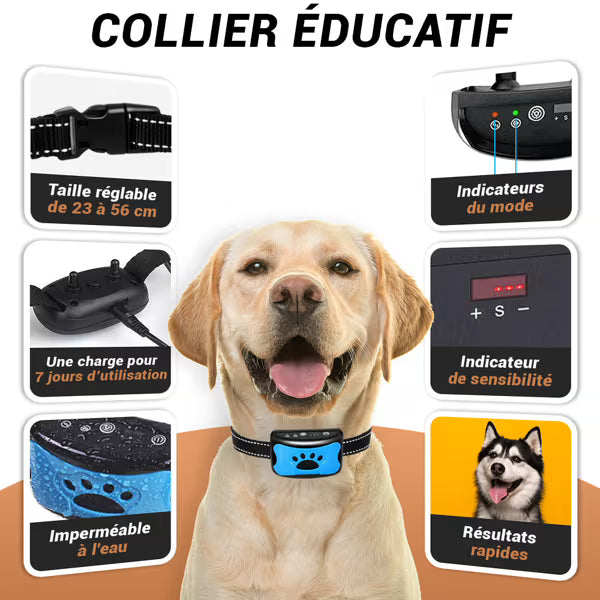 Ce collier anti-aboiement ne se contente pas de limiter les aboiements excessifs : il sert de support éducatif pour aider votre chien à adopter un comportement plus calme dans son quotidien.